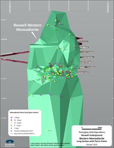 • An intensive underground diamond core drilling program within and extensions to the current Inferred Resource hosted by the Western Monzodiorite domain at Roswell is in progress. Results have been received from 89 holes totalling 18,064 metres that were focussed within the mid-portion of the monzodiorite domain infilling existing drilling to a nominal 15m x 20m grid spacing for the purpose of converting to an Indicated Resource. The drilling confirmed multiple wide, high-grade gold intercepts within the 30m thick monzodiorite. Best intercepts include: